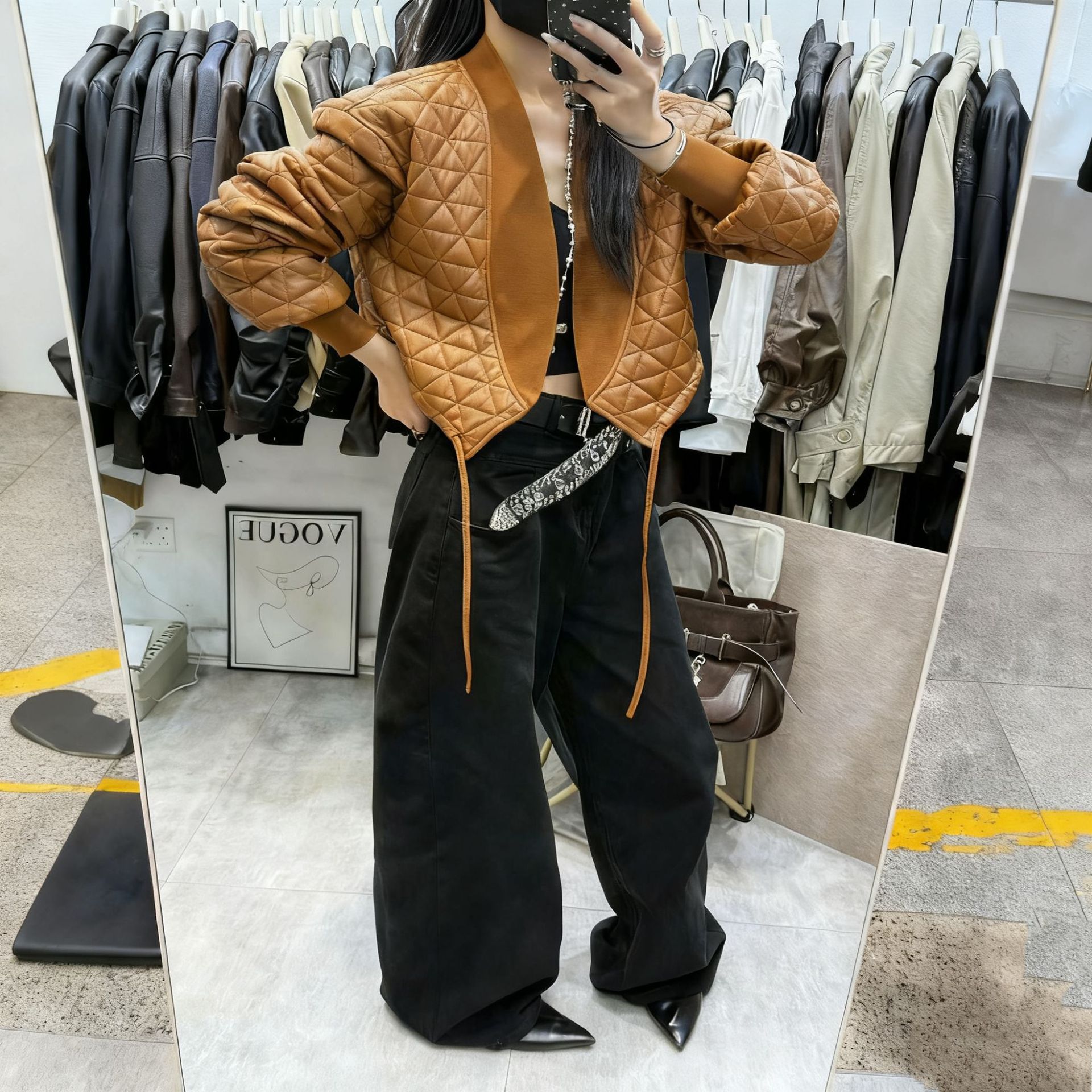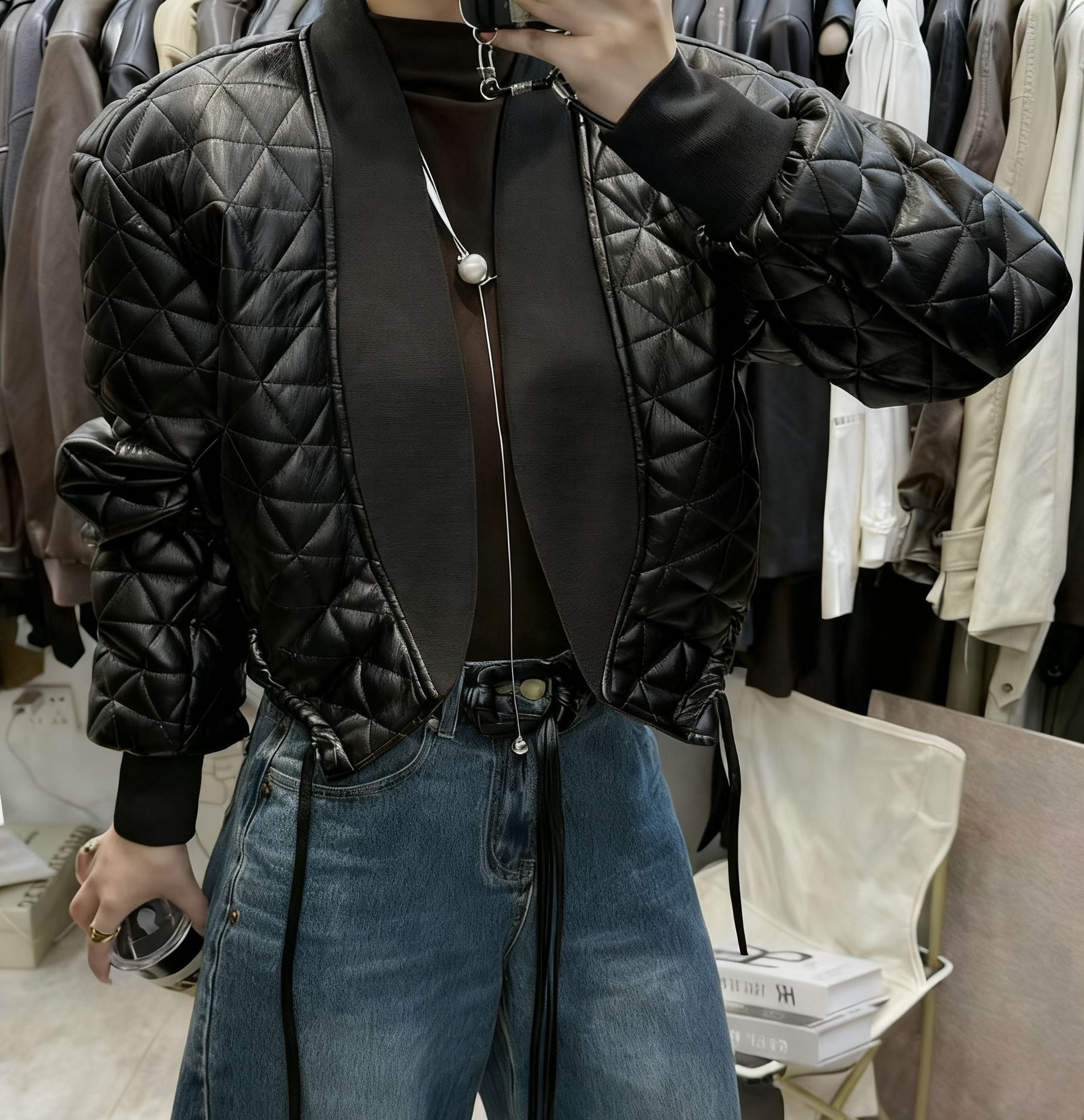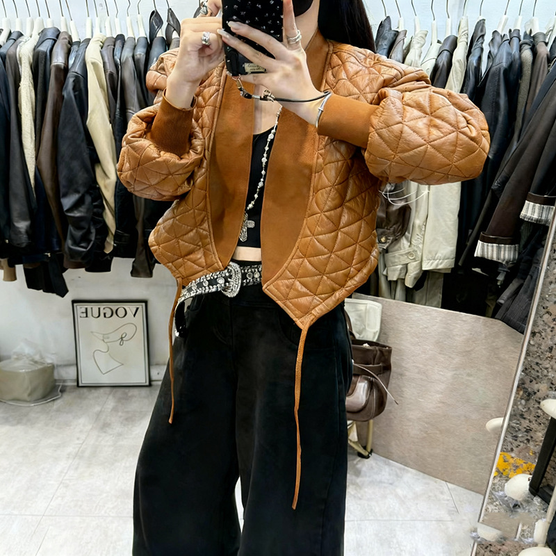 Temperament Long-sleeve Plaid Loose Cotton-padded PU Leather Jacket