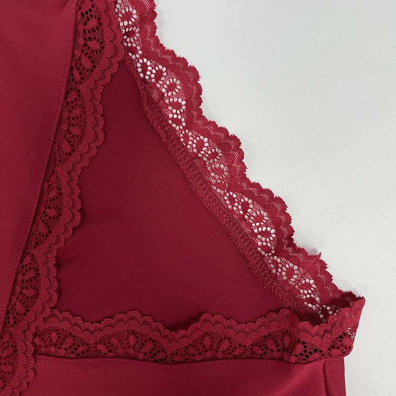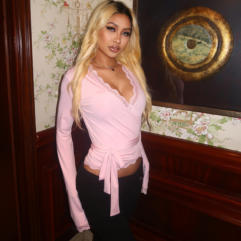 Valentine's Day Women's Solid-Color V-Neck Lace-trimmed Lace-up Long-Sleeve Top